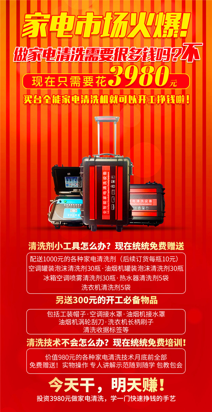 兩臺機(jī)器加在一起,就是7000塊錢,宣傳品和小工具等都是公司*費(fèi)配送的,清洗技術(shù)也是*費(fèi)培訓(xùn)的。一句話,就是兩臺機(jī)器的費(fèi)用,其他一切都是*費(fèi)的。現(xiàn)在正是清洗家電清洗油煙機(jī)清洗地暖的旺季,做的話,務(wù)必抓緊時間啊,一個月輕輕松松的掙個兩三萬。